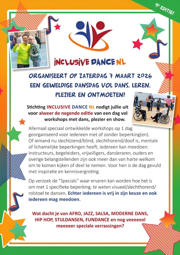 Deze dag is bedoeld voor mensen met en zonder beperking en biedt workshops in verschillende dansstijlen, zoals salsa, hiphop, jazz, rolstoeldansen en meer.